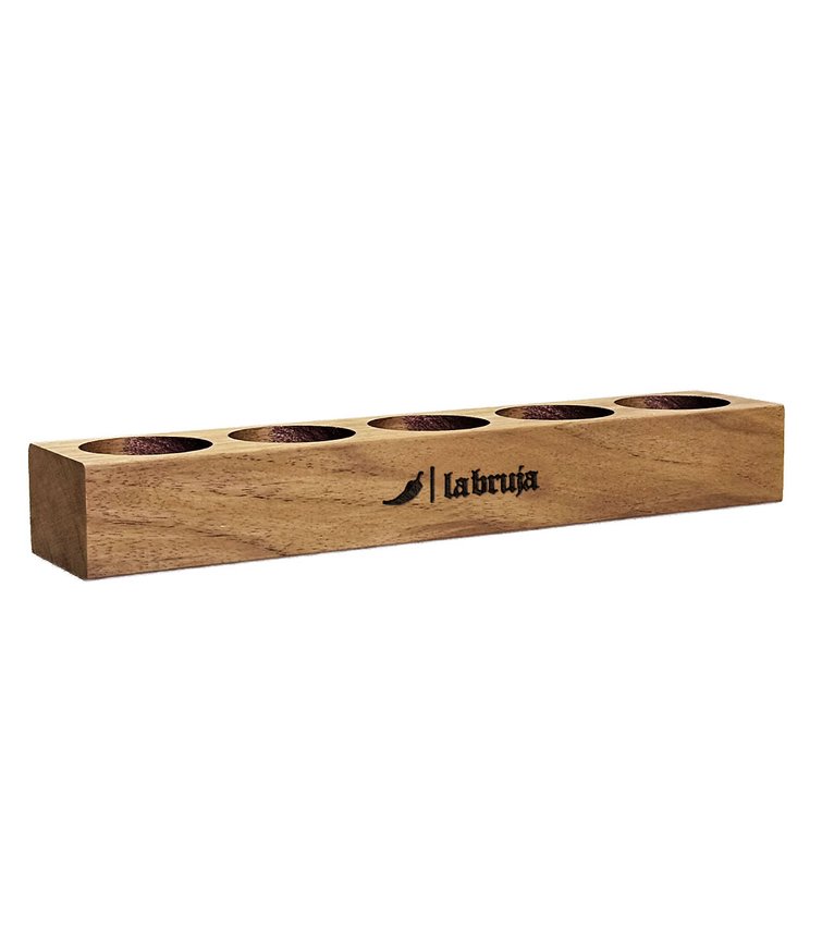 Base perfeita pra você levar à mesa 5 molhos LaBruja 150ml PET. A logo é gravada com ferro quente, tudo feito artesanalmente!